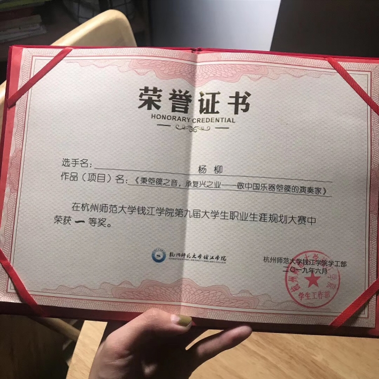 杨柳:大四准备考教师资格证,在浙江省职业规划大赛中取得好成绩,未来希望从事箜篌推广相关的工作。